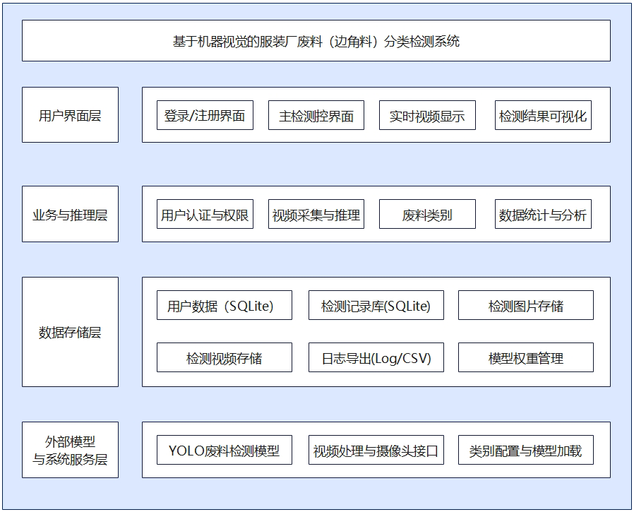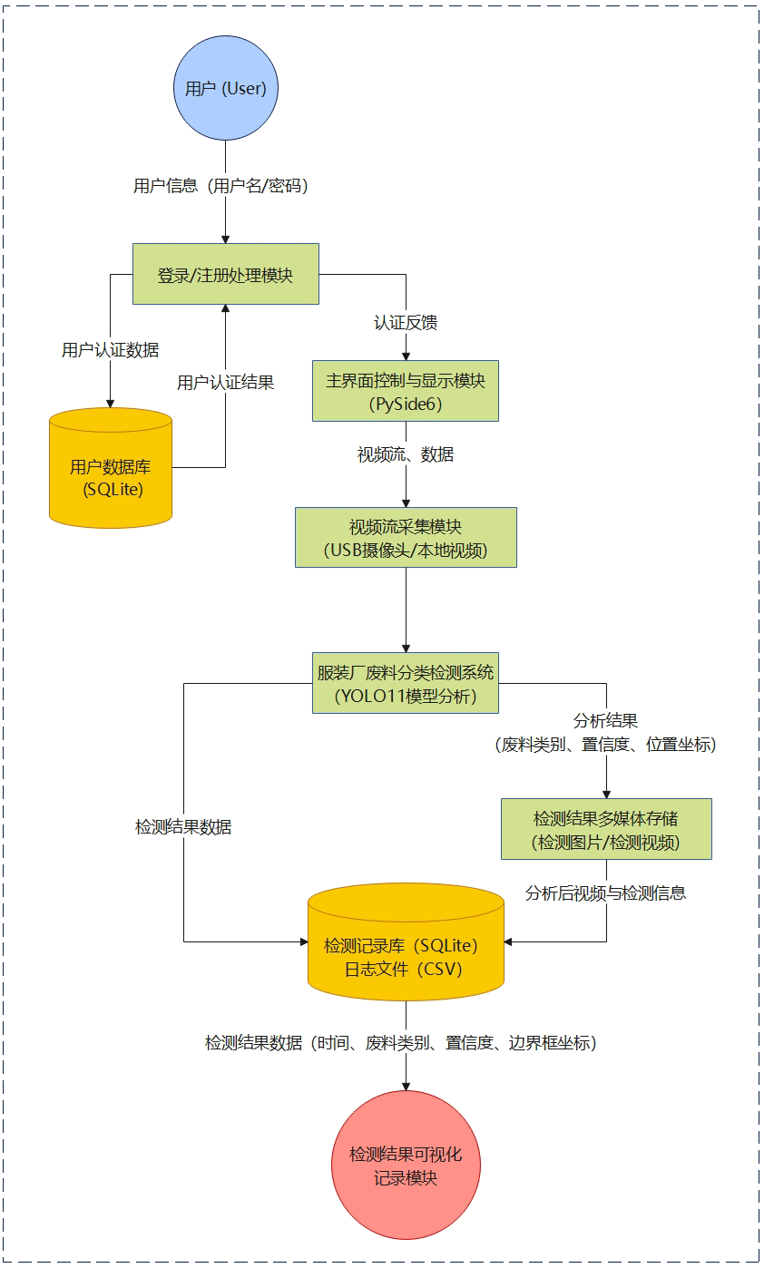 本系统采用 USB 摄像头采集图像数据,结合 YOLO11 目标检测算法实现服装厂废料的实时分类识别,并通过可视化界面与数据库完成检测结果展示与存储管理。