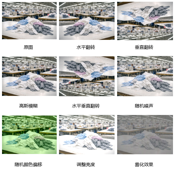 在实现过程中,本文针对服装厂废料目标的成像特点,采用几何变换与图像质量扰动相结合的数据增强策略,以增强模型在多视角、多光照与复杂背景条件下的适应能力。其中,几何变换包括水平翻转、垂直翻转及组合翻转,用于模拟摄像头视角变化与废料摆放方向差异;图像质量扰动包括高斯模糊、随机噪声、雾化(低对比度)、颜色偏移以及亮度调节,用于模拟车间中光照波动、镜头抖动、尘埃干扰以及运动模糊等实际环境因素。