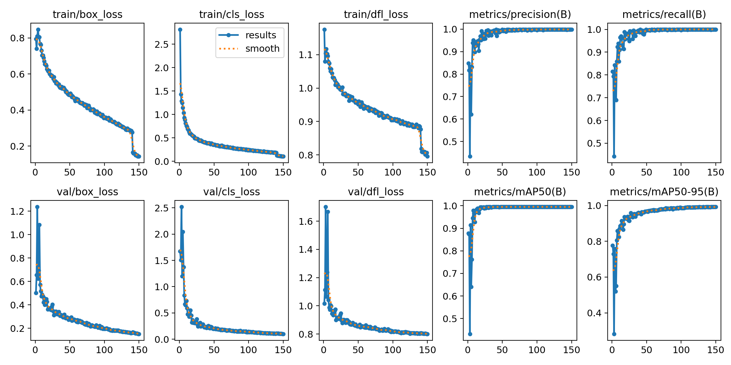 训练 150 个 epoch 后模型在验证集上表现优异,整体 Precision=0.999、Recall=1.000、mAP@0.5=0.995、mAP@0.5:0.95=0.993,且单张推理约 4.8ms,满足高精度与实时性要求。