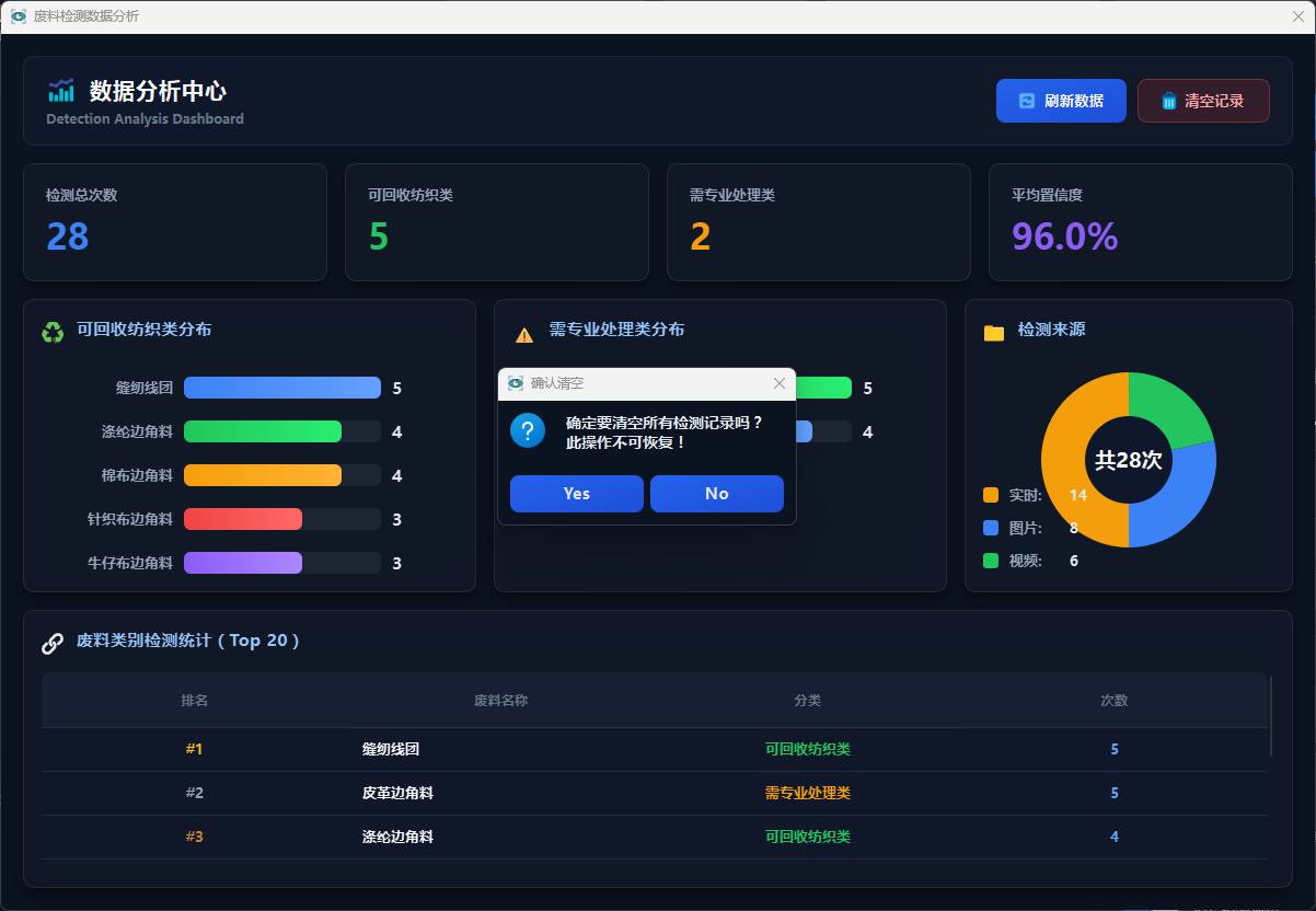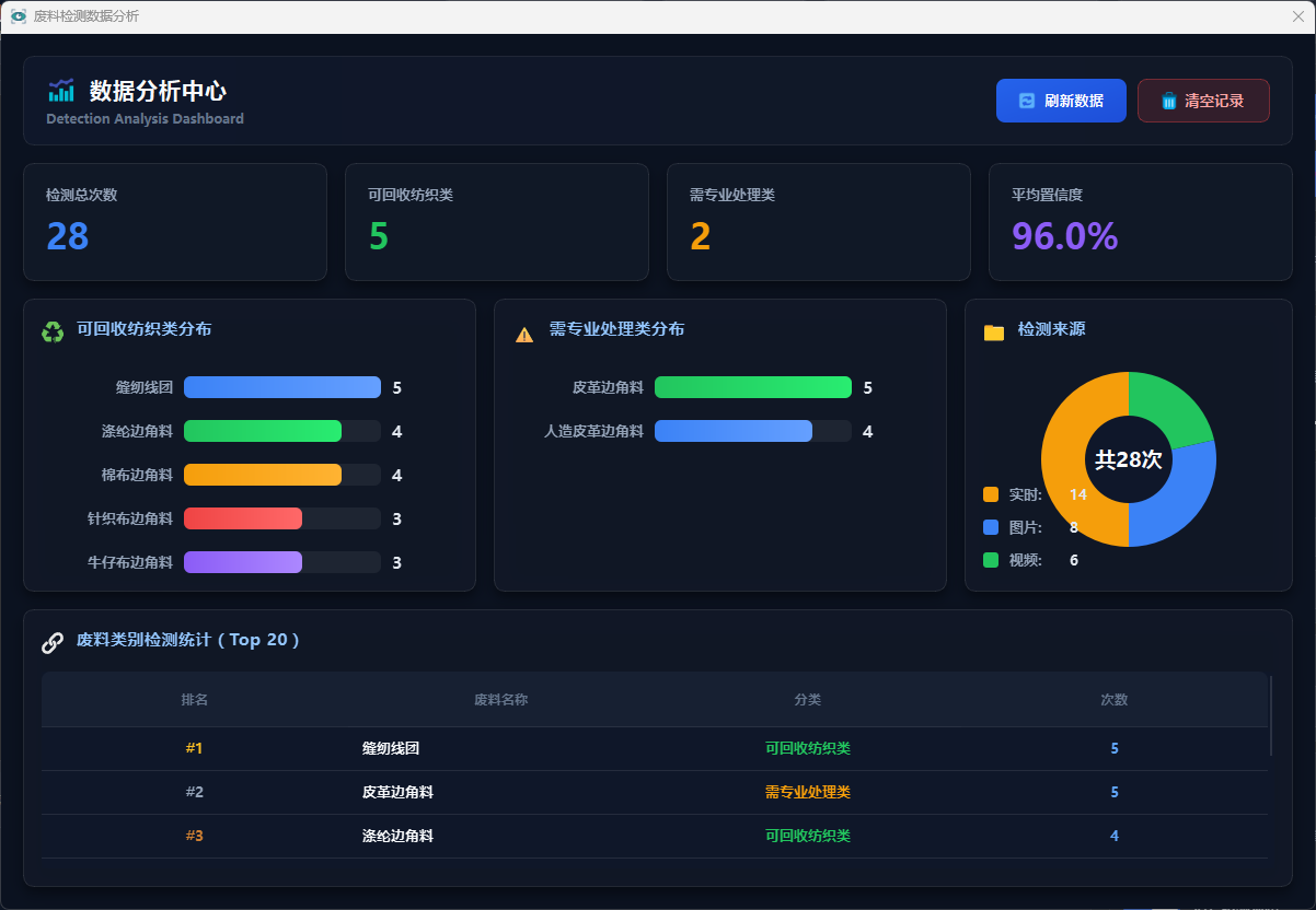 系统采用 USB 摄像头采集废料图像与视频数据,基于 YOLO11 目标检测算法构建废料检测模型,实现对棉布边角料、牛仔布边角料、针织布边角料、皮革碎料、涤纶边角料、缝纫线团及人造皮革碎料等 7 类废料的识别与定位。系统通过 PySide6 开发图形化界面,集成单张检测、视频检测与实时检测等功能模块,并提供置信度阈值与交并比阈值调节、检测结果表格展示、运行状态提示、检测日志保存以及检测图片/视频输出等功能。同时,系统引入 SQLite 数据库对检测记录进行存储,实现检测数据的管理与统计分析。此外,根据废料是否具有回收价值,将检测结果划分为可回收纺织类和需专业处理类,为后续分拣处理提供辅助决策依据。