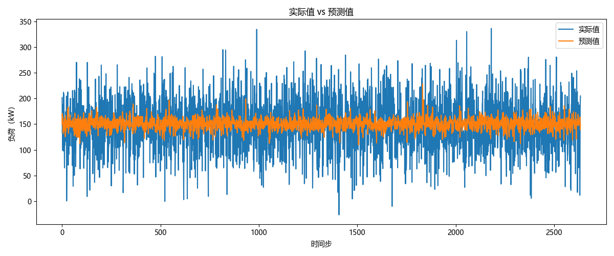 该图比较了实际负荷(蓝色)与预测负荷(橙色)随时间的变化情况。模型能够合理地预测负荷趋势,但仍然存在一些波动,表明模型在负荷预测方面有一定的精度,但也存在一定的误差。