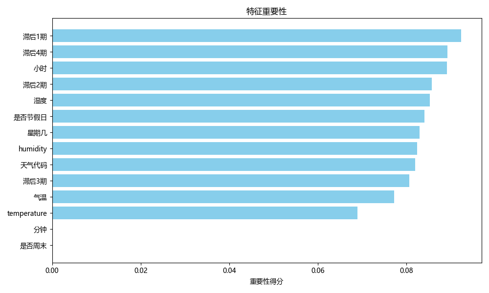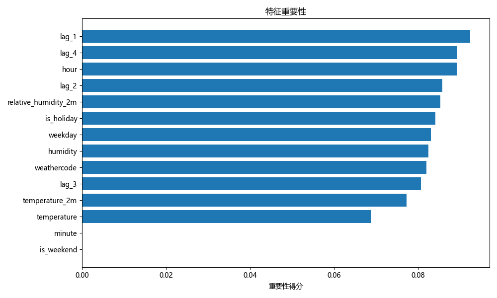 该图显示了“滞后期”特征、时间(小时)、温度等特征的重要性。”满后1期”(滞后期特征)对模型预测能力的影响最大,表明历史负荷数据对预测的影响最为显著。