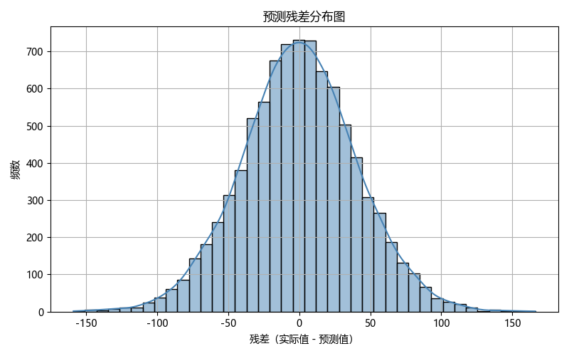 该直方图展示了预测残差(实际值与预测值之间的差异)的分布情况。残差呈钟形分布,表明模型的预测误差大致围绕零分布,模型的预测精度较好。