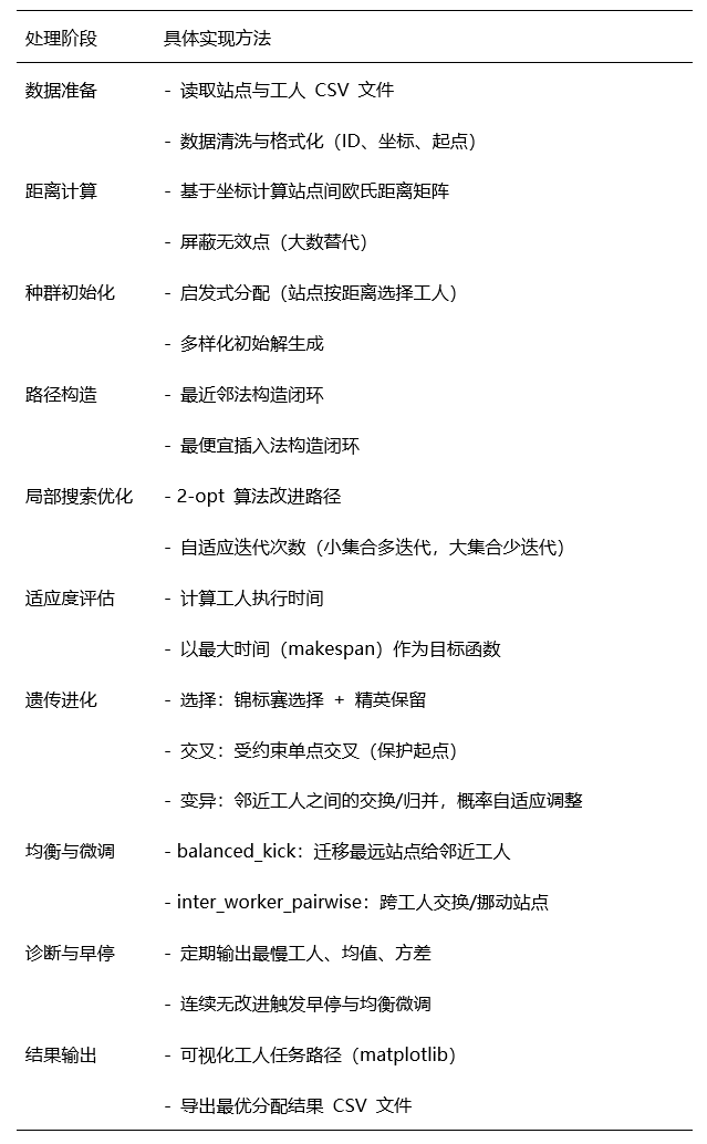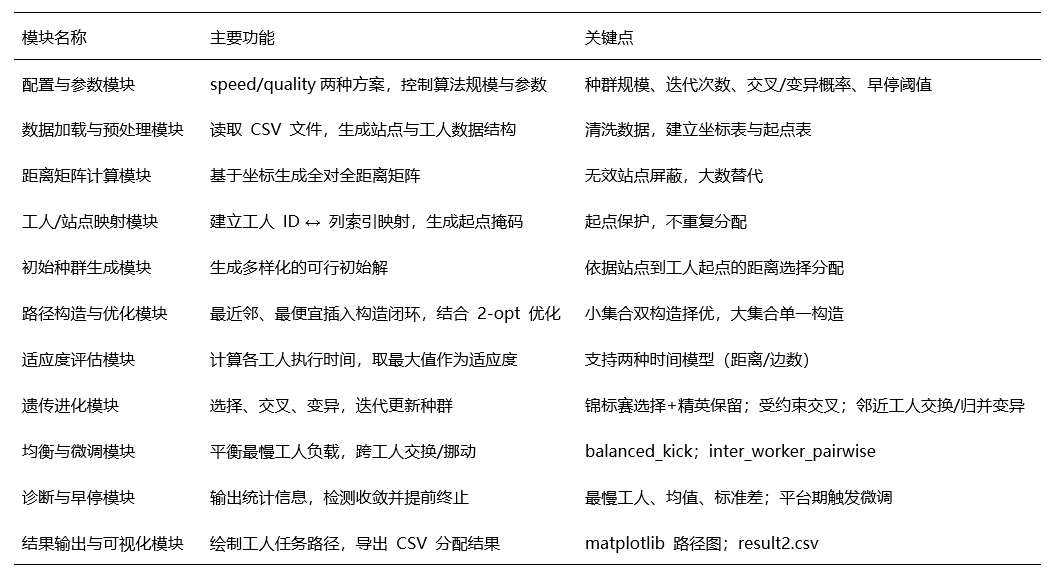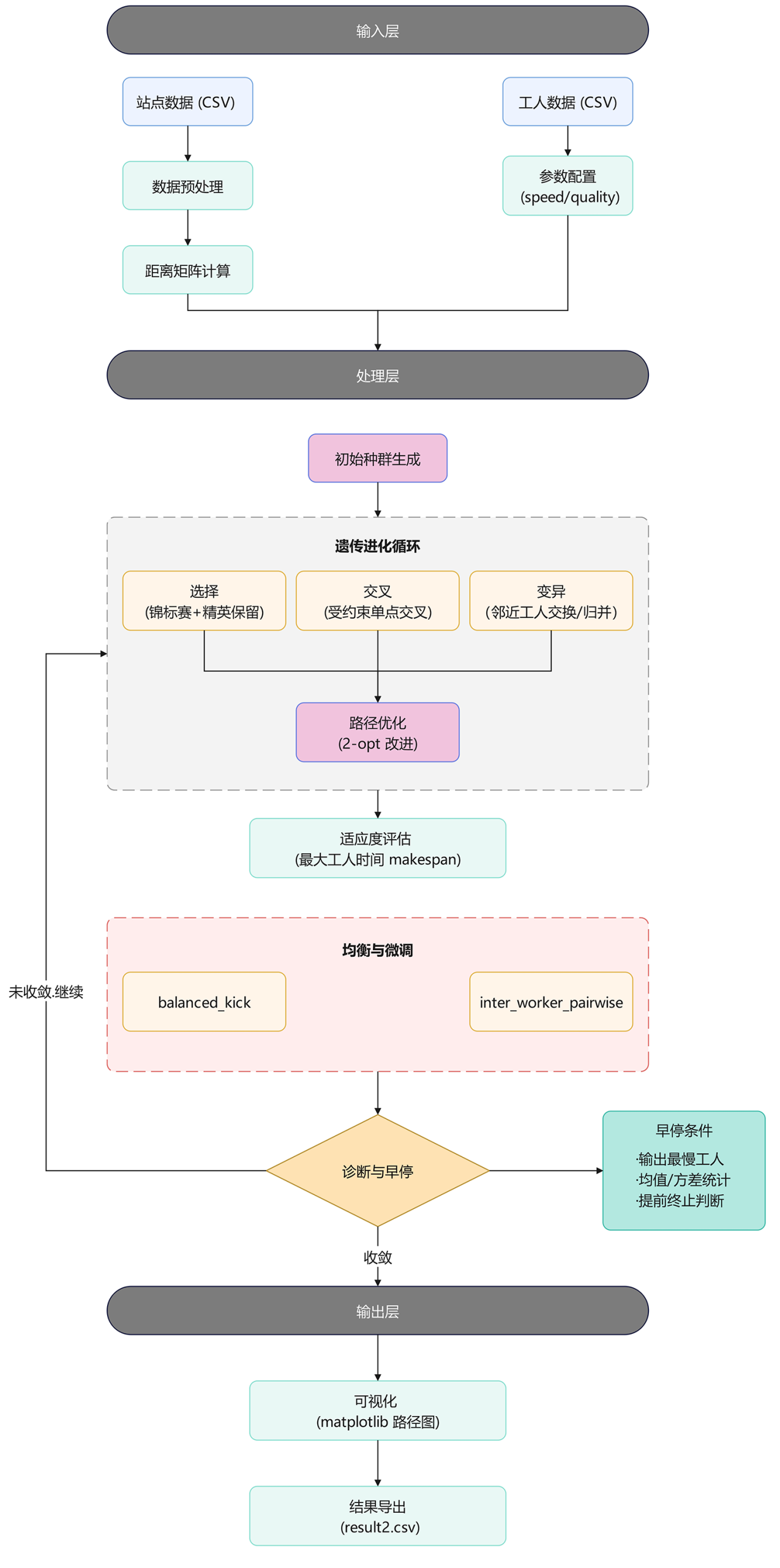 整个系统通过数据预处理、路径构造与优化、遗传进化与均衡微调等模块协同运行,实现工人任务站点的最优分配、路径优化与结果输出。