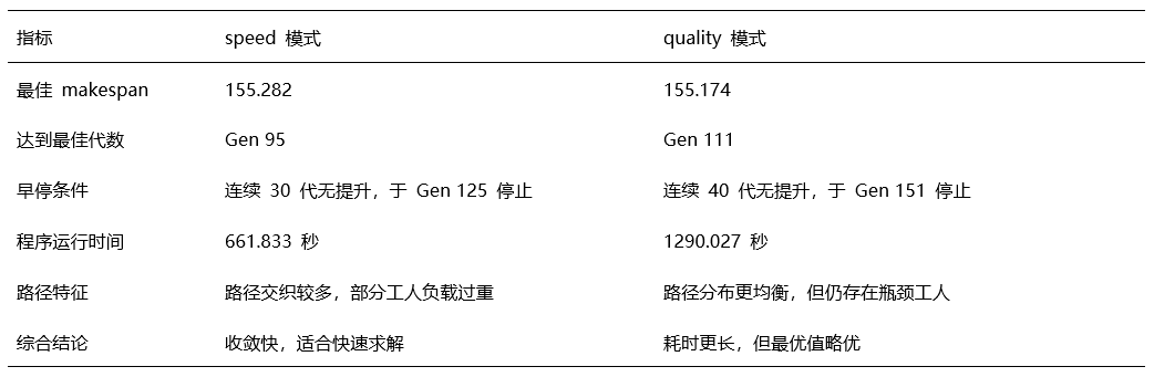 结果分析总结:与 speed 模式相比,quality 模式在更长的运行时间下取得了略优的 makespan 与更均衡的路径分布,体现了计算代价与解质量之间的权衡。