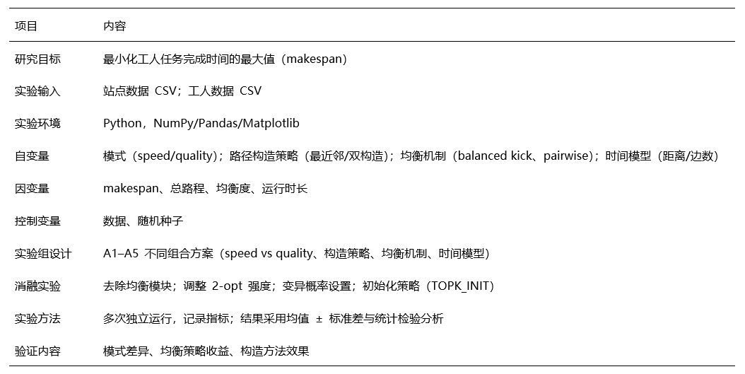 实验设计通过设置模式、构造、均衡与时间模型等自变量,在固定数据和种子的条件下,比较 makespan、路程、均衡度和时长等因变量表现。