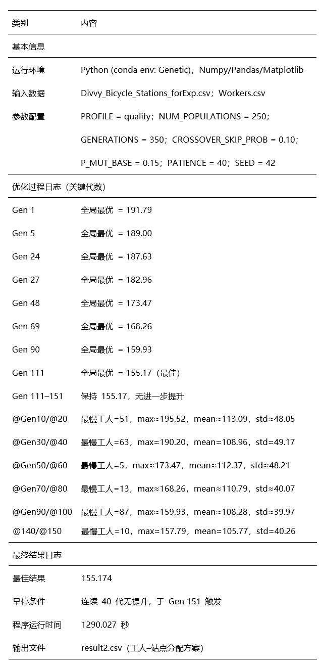 摘要:随着共享单车数量的快速增长,其日常运维与维修任务的复杂性不断提升。如何合理分配工人任务、优化巡检维修路径,成为提升共享单车服务质量和降低运营成本的关键问题。传统的任务分配方法难以在多工人、多站点的复杂环境中取得满意效果。本文提出一种基于遗传算法的共享单车工人维修调度优化方法。该方法通过构建工人-站点任务分配模型,引入选择、交叉、变异等遗传操作,并结合 2-opt 局部搜索与平衡策略,有效提高了算法的收敛效率与解的质量。实验基于真实共享单车站点数据和工人起点数据进行仿真,结果表明该方法能够在较短时间内获得较优的调度方案,实现工人工作负载的均衡分配,并显著降低最长作业时间。研究表明,遗传算法在共享单车维修调度问题中具有良好的适应性与应用前景。