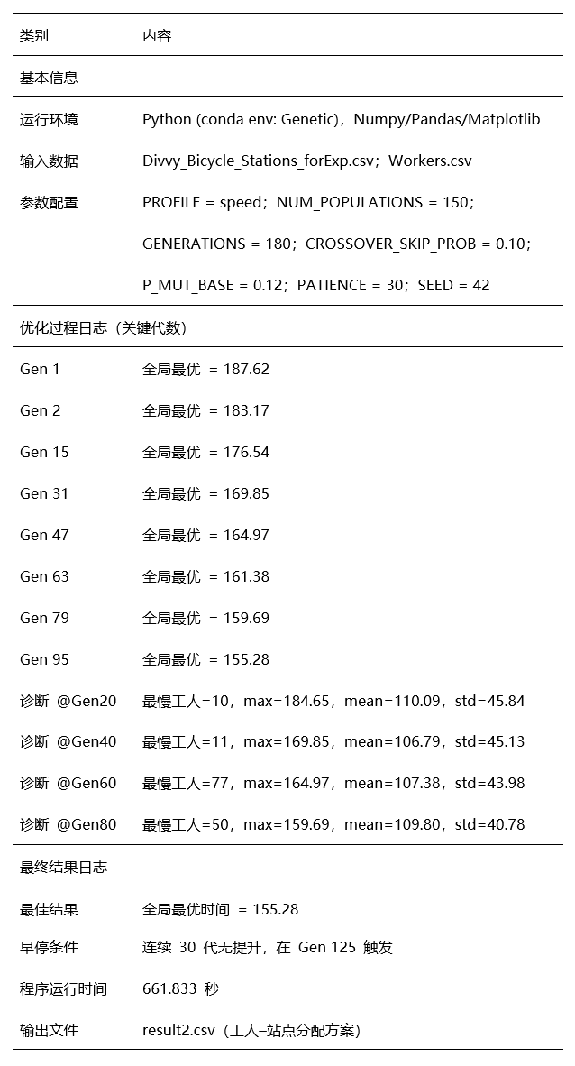 本研究基于遗传算法实现了对工人任务路径的优化分配,在不同模式下对比发现,speed 模式能够较快收敛并给出可行解,而 quality 模式则在更高的迭代和种群规模支持下获得了更低的 makespan 和更均衡的路径分布。尽管如此,仍存在个别工人路径过长、负载不均的瓶颈问题。未来的研究可在此基础上引入更强的局部搜索算子(如 3-opt、Or-opt)、多目标优化框架以及并行计算方法,以进一步缩短运行时间、降低瓶颈工人负担,并提升整体调度的稳定性与实用性。