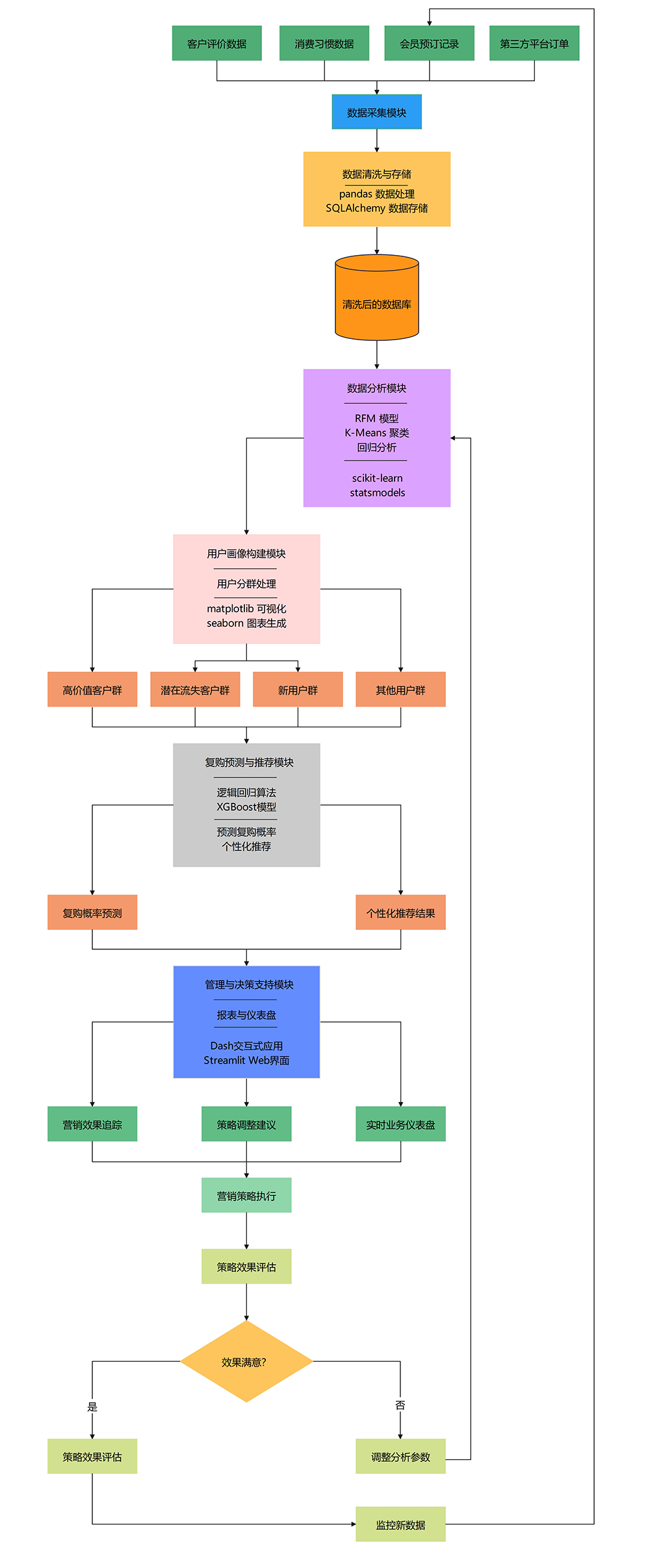 该系统的总体架构由多个功能模块构成,首先是数据采集模块。系统需要整合来自不同渠道的数据,包括会员预订记录、客户评价、消费习惯以及第三方平台订单等。在实现层面,通过 Python 的 pandas 与 SQLAlchemy 可以完成数据的清洗、转换与存储,为后续分析奠定基础。