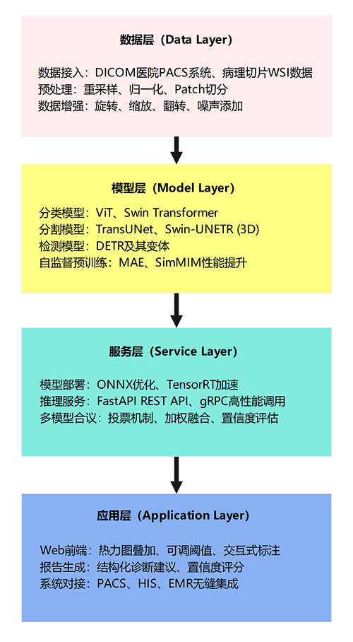 模型层:在模型选择方面,系统针对不同的诊断任务设计了差异化的 Transformer 架构。对于分类任务,采用 Vision Transformer(ViT)与 Swin Transformer;对于分割任务,引入 TransUNet 与 Swin-UNETR,以适应三维医学影像的特性;对于检测任务,则采用 DETR 及其改进变体。与此同时,系统还结合了 MAE、SimMIM 等自监督预训练策略,从而在有限标注样本条件下显著提升模型的性能与稳定性。