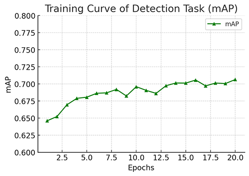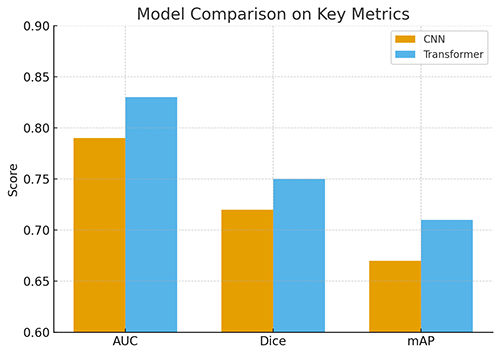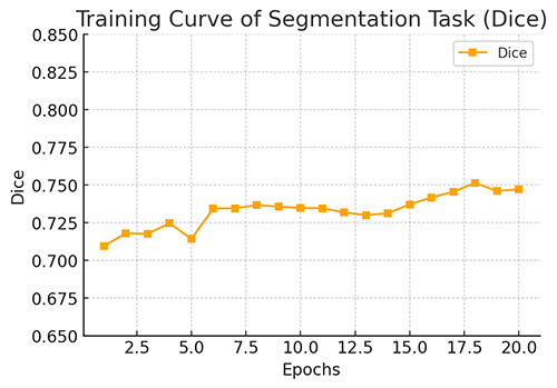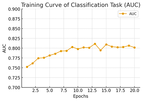 评估指标:在分类任务中,系统采用受试者工作特征曲线下面积(AUC)、敏感度(Sensitivity)与特异度(Specificity)作为主要评价指标,以全面衡量模型在疾病识别中的判别能力。在分割任务中,则使用 Dice 系数与交并比(IoU)评价模型在病灶与器官区域分割的准确性与一致性。在检测任务中,系统采用平均精度均值(mAP)以及自由反应接收者操作特征曲线(FROC),以评估模型在不同阈值下对目标病灶的检出能力。
