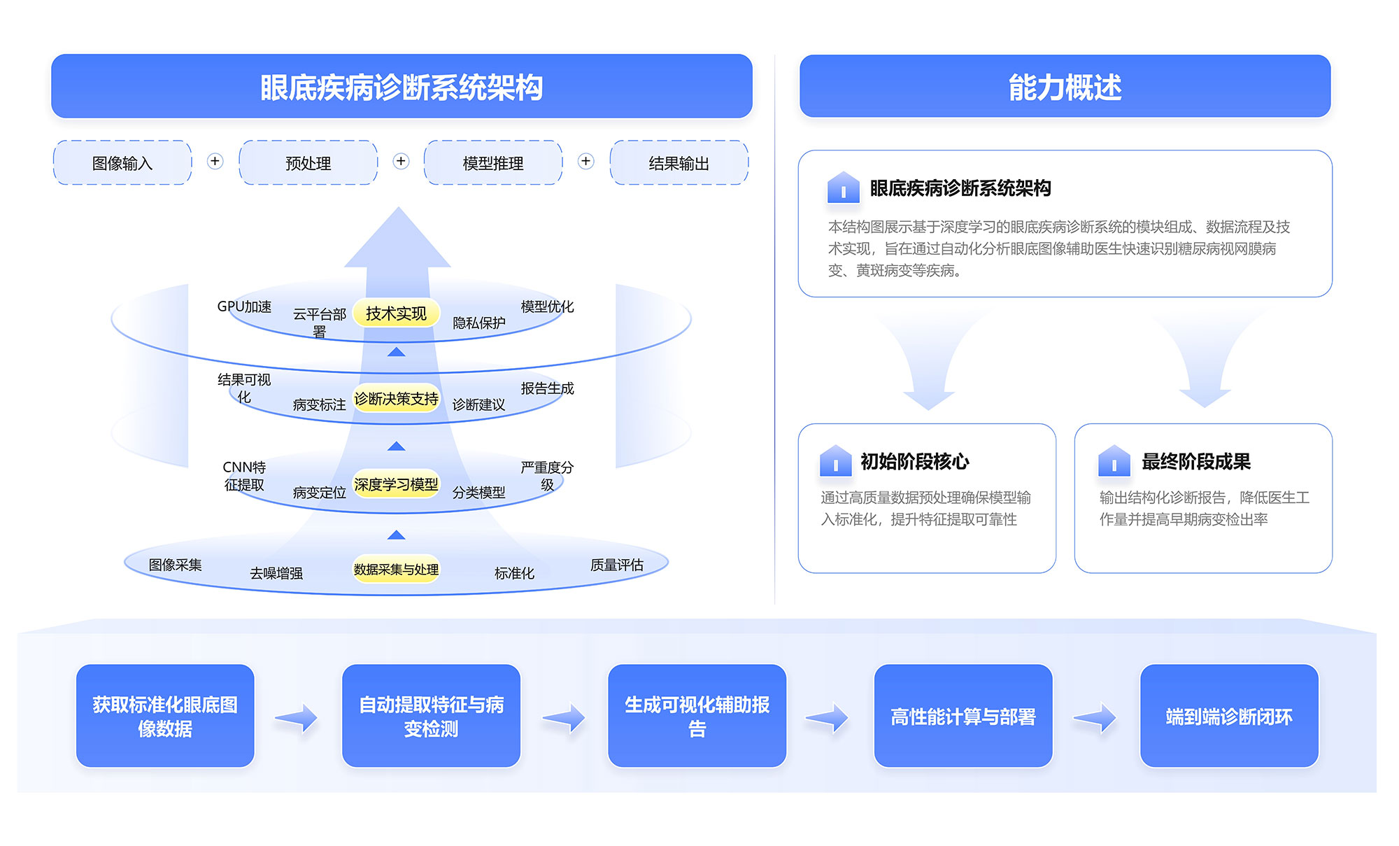 深度学习的眼底疾病诊断系统通常由多个关键模块组成,以确保高效、准确地诊断眼底疾病。首先,系统通过数据采集与预处理模块从眼科检查设备获取眼底图像,并进行去噪、增强对比度、标准化等处理,确保图像质量。接着,特征提取与病变检测模块利用卷积神经网络(CNN)等深度学习技术,自动从图像中提取病变特征并进行定位,识别出微小的病变区域。随后,分类与预测模块根据提取到的病变信息对眼底图像进行分类,如糖尿病视网膜病变、黄斑病变等,并预测病变的严重程度。最后,结果反馈与医生辅助决策模块会将自动化诊断结果反馈给医生,提供直观的病变区域标注,协助医生做出更精准的临床决策。这些模块协同工作,使得系统能够在提高诊断效率的同时,确保高精度的结果,最终帮助医生进行快速、准确的眼底疾病诊断。