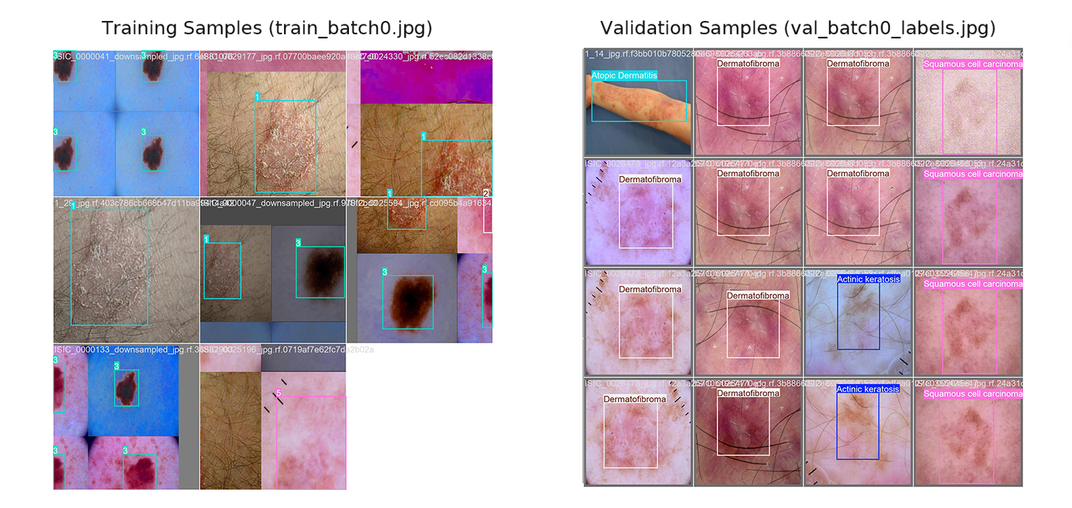 这张图展示了训练样本和验证样本的可视化,左侧是训练集图像,右侧是验证集图像,并标注了相应的皮肤病类型(如皮肤纤维瘤、鳞状细胞癌等),有助于理解模型如何学习并检测不同类型的皮肤病。
