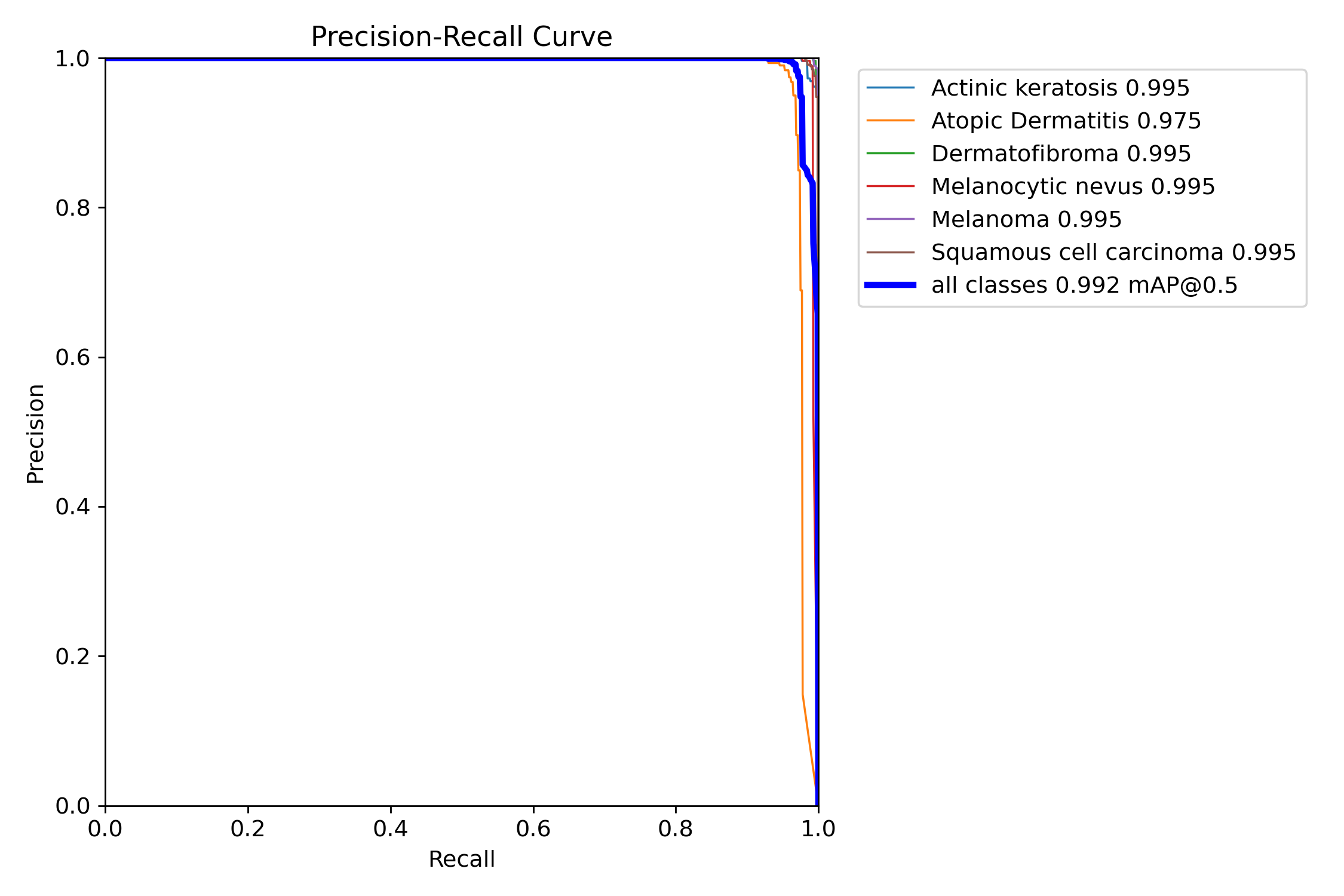 这张精度-召回曲线(Precision-Recall Curve)展示了各个皮肤病类别(如日光性角化病、特应性皮炎等)在不同召回率下的精度,所有类别的精度值都接近1,表明模型在各个类别上表现非常优秀,总体mAP@0.5为0.992。