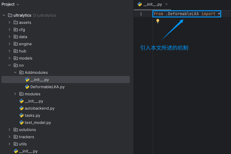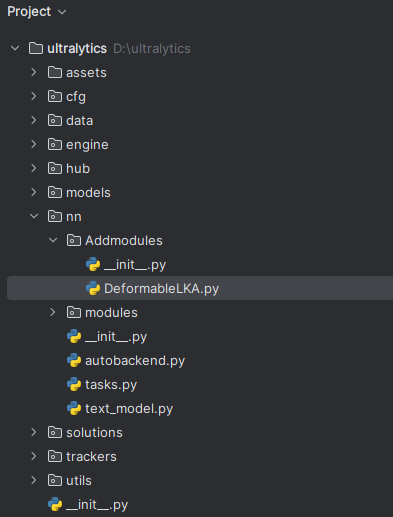 在 ‘AddModules’ 目录下创建一个新的 Python 文件,命名为 ‘_init.py_’(如果该目录已存在于现有的算法改进文件中,则无需重新创建)。在该文件内部导入所需的检测头模块,如下图所示。这一步骤是确保模块能够被正确加载和引用。