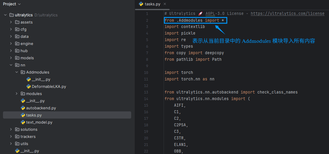 在 ‘ultralytics/nn/tasks.py’ 文件中完成必要的导入和模块注册(如果该目录已存在于现有的算法改进文件中,则无需重新创建,可以跳过此步骤,直接进入第四步)。该步骤确保模块能够在系统中正确识别并顺利调用。