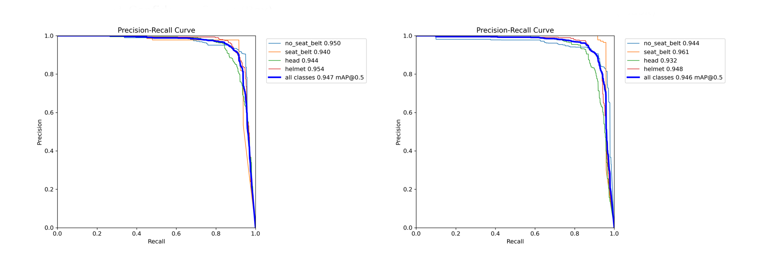 从各类别表现来看,模型在 “no_seat_belt” 和 “helmet” 类别上达到最高的检测性能(mAP@50 分别为 0.950 和 0.954),说明模型在这类目标样本上具有较强的辨识能力。对于 “seat_belt” 和 “head” 类别,模型的 mAP@50 分别为 0.940 和 0.944,尽管 “seat_belt” 类别的 Recall 有所提升,但 Precision 稍有下降,表现出一定的权衡。