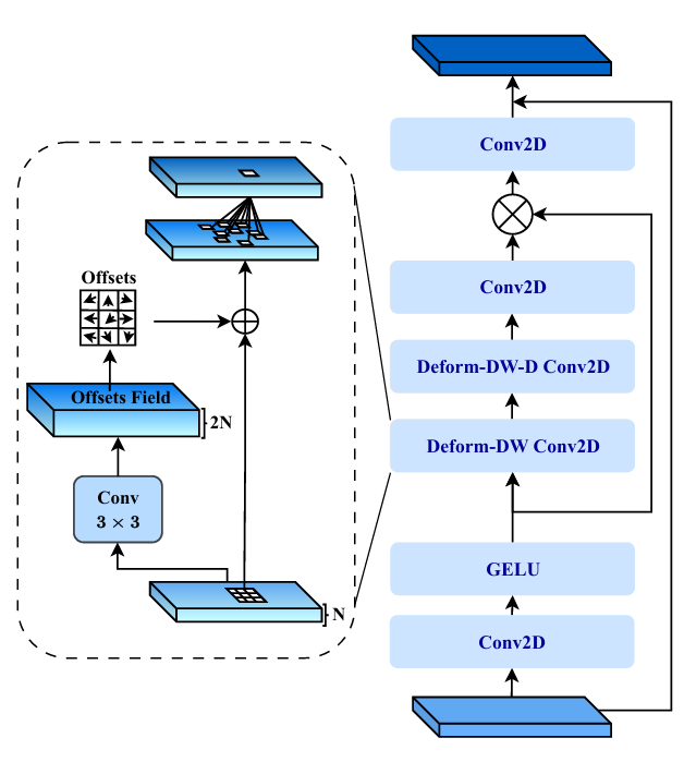 整体来看,该模块通过结合标准卷积、可变形卷积和偏移场计算,以及非线性激活函数,构建了一个具有高度灵活性的特征提取机制,极大地增强了Deformable-LKA对复杂视觉模式的适应能力和鲁棒性,尤其在处理具有多样形态和尺度变化的目标时表现尤为突出。
