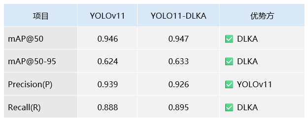 此外,从图中 mAP@50 综合值 可见,YOLO11-DLKA 模型在各类别上的检测结果更加均衡,整体 mAP@50 提升至 0.947(较 YOLOv11 的 0.946 略有提高),表现出更好的鲁棒性与泛化能力。该结果验证了在 YOLOv11 框架中引入 Deformable-LKA 模块 对提升模型整体检测性能的有效性与可行性。