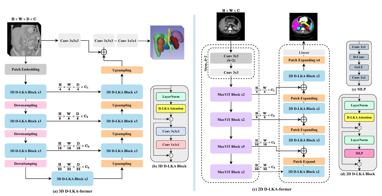图2 左侧为3D D-LKA模型的提出网络架构,右侧为2D D-LKA模型的架构。
