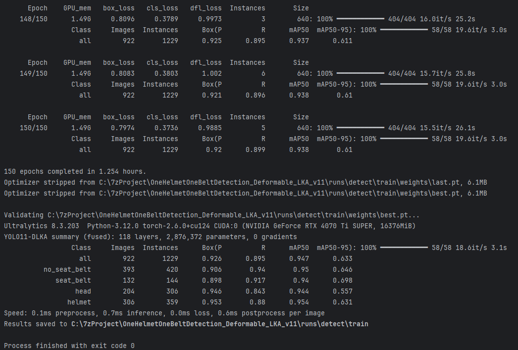 本研究使用 汽车安全带与电动车头盔图像数据集 对改进后的 YOLO11-DLKA 模型进行了训练,并完成了 150 个 epoch 的训练过程,耗时约 1.254 小时。最终训练模型在验证集上的整体性能如下:Precision 为 0.926,Recall 达到 0.895,mAP@50 为 0.947,mAP@50-95 为 0.633,表现出良好的检测精度与稳定性。