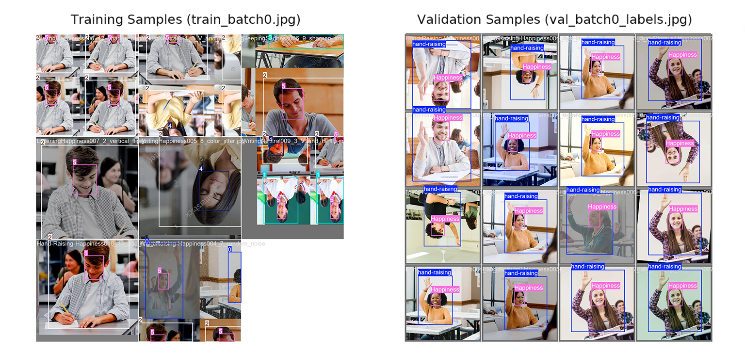 这张图展示了训练样本和验证样本的可视化,左侧是训练集图像,右侧是验证集图像,并标注了相应的学生行为和表情类型,有助于理解模型如何学习并检测不同类型的行为和表情。