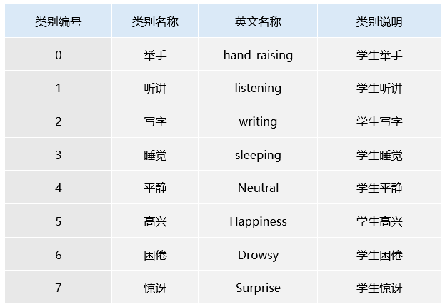 (2)图像格式:JPG/PNG格式,缺少学生专注度的定量信息,适合行为和表情检测与分类。