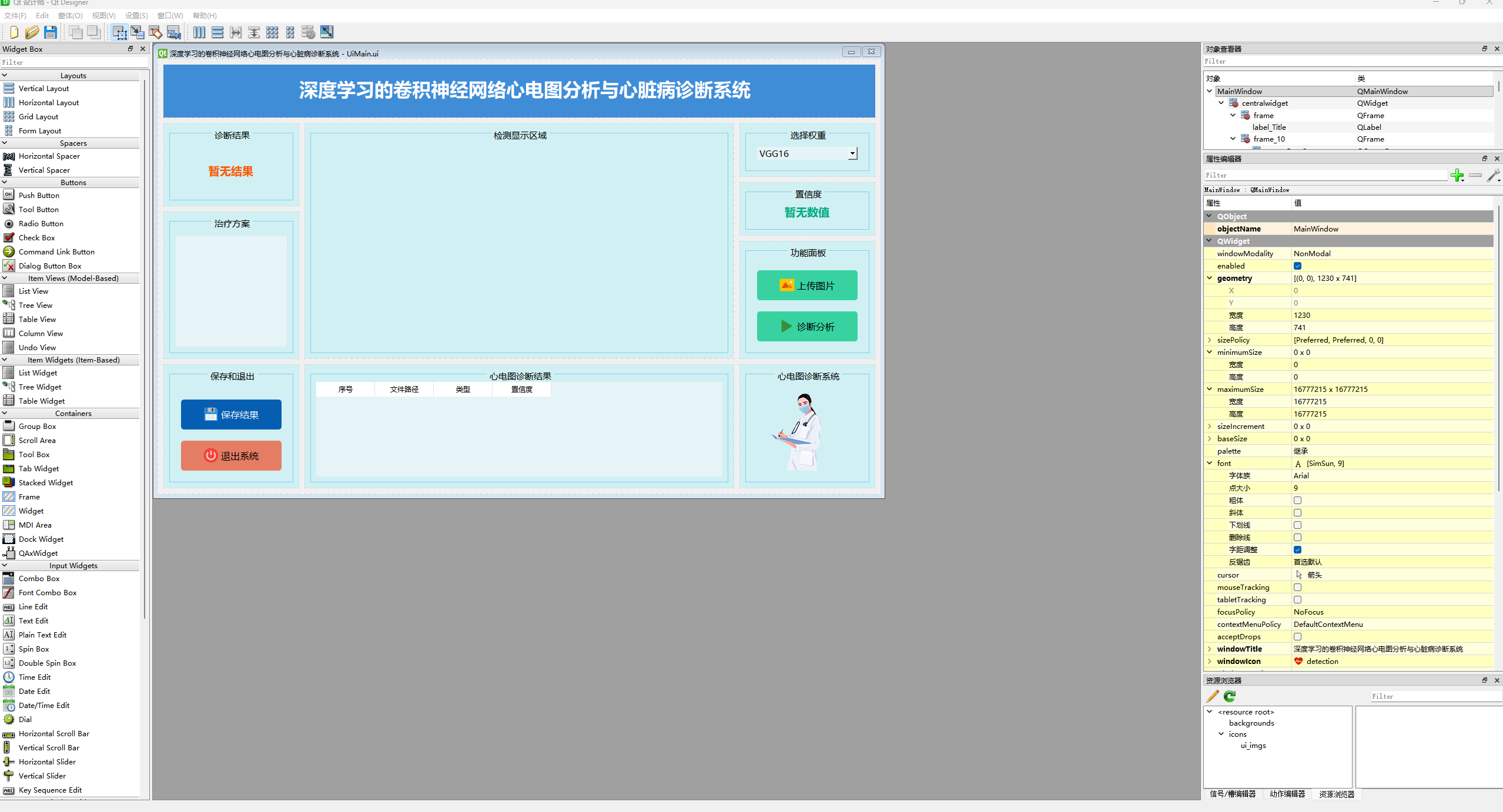 本系统旨在实现心电图(ECG)信号的自动分析与心脏病诊断,采用“数据输入 + 模型推理 + 结果展示”的一体化工作模式。系统架构包括图像输入模块、图像预处理模块、数据集准备模块、VGG16/ResNet50训练模块、推理与检测模块、界面与用户交互模块、检测结果展示模块以及实验结果与性能评估模块。前端界面通过图形用户界面(GUI)支持心电图数据的导入与交互操作,而后端则基于VGG16或ResNet50模型进行实时心电图分析与心脏病分类。VGG16与ResNet50模型在心电图信号分类任务中展现了较高的准确性和效率,能够有效区分心肌梗死(MI)、心律不齐(ARR)和正常心律(NL)等三类心脏疾病,因此具有广泛的应用前景,特别是在心脏病诊断与健康监测领域。