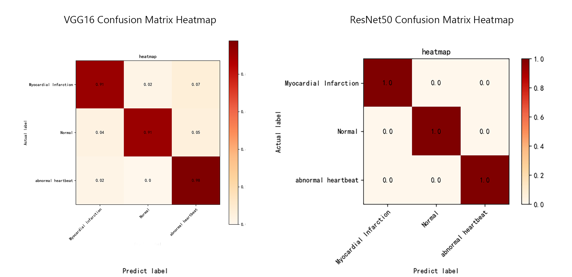 摘要:随着深度学习在医学影像分析中的广泛应用,心电图(ECG)作为一种重要的临床诊断工具,已被用于心脏病的早期预警和诊断。本文提出并比较了基于卷积神经网络(CNN)的两种深度学习模型——ResNet50与VGG16,在心电图信号分析中对心肌梗死(MI)、心律不齐(ARR)、正常心律(NL)三类心脏疾病的分类性能。