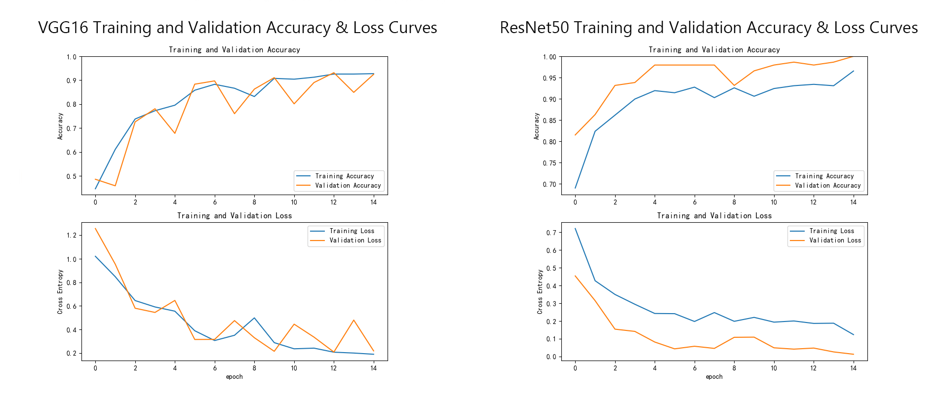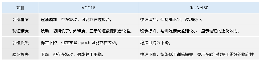 总体来看,VGG16在训练中易出现过拟合,验证表现波动较大;而ResNet50在训练和验证阶段均表现稳定,具有更强的泛化能力和更平滑的收敛特性。