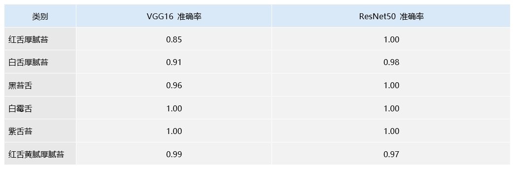 从这两张混淆矩阵热力图来看,VGG16 和 ResNet50 都在大多数类别上有着较高的预测准确率,尤其是“黑苔舌”和“地图舌”类别,几乎达到了100%的准确率。VGG16 在“红舌黄腻厚腻苔”类别上有较多的误分类(9%),而 ResNet50 在“红舌黄腻厚腻苔”类别的误分类更少,仅为1%,表现出更高的精度。