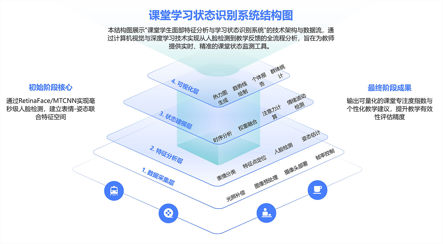 在人工智能赋能教育的背景下,课堂正从传统教学走向数据驱动与智能交互。本系统基于计算机视觉与情感计算技术,融合面部特征识别与学习状态建模,实时分析学生表情与专注度,为教师提供量化反馈,助力教学由经验化向智能化转变。