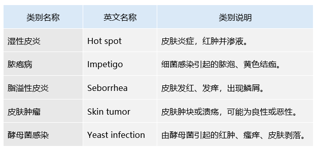 本数据集用于宠物皮肤病影像的分类模型训练与验证,包含五类样本:湿性皮炎(Hot spot)、脓疱病(Impetigo)、脂溢性皮炎(Seborrhea)、皮肤肿瘤(Skin tumor)和酵母菌感染(Yeast infection)。可应用于以下研究与开发方向: