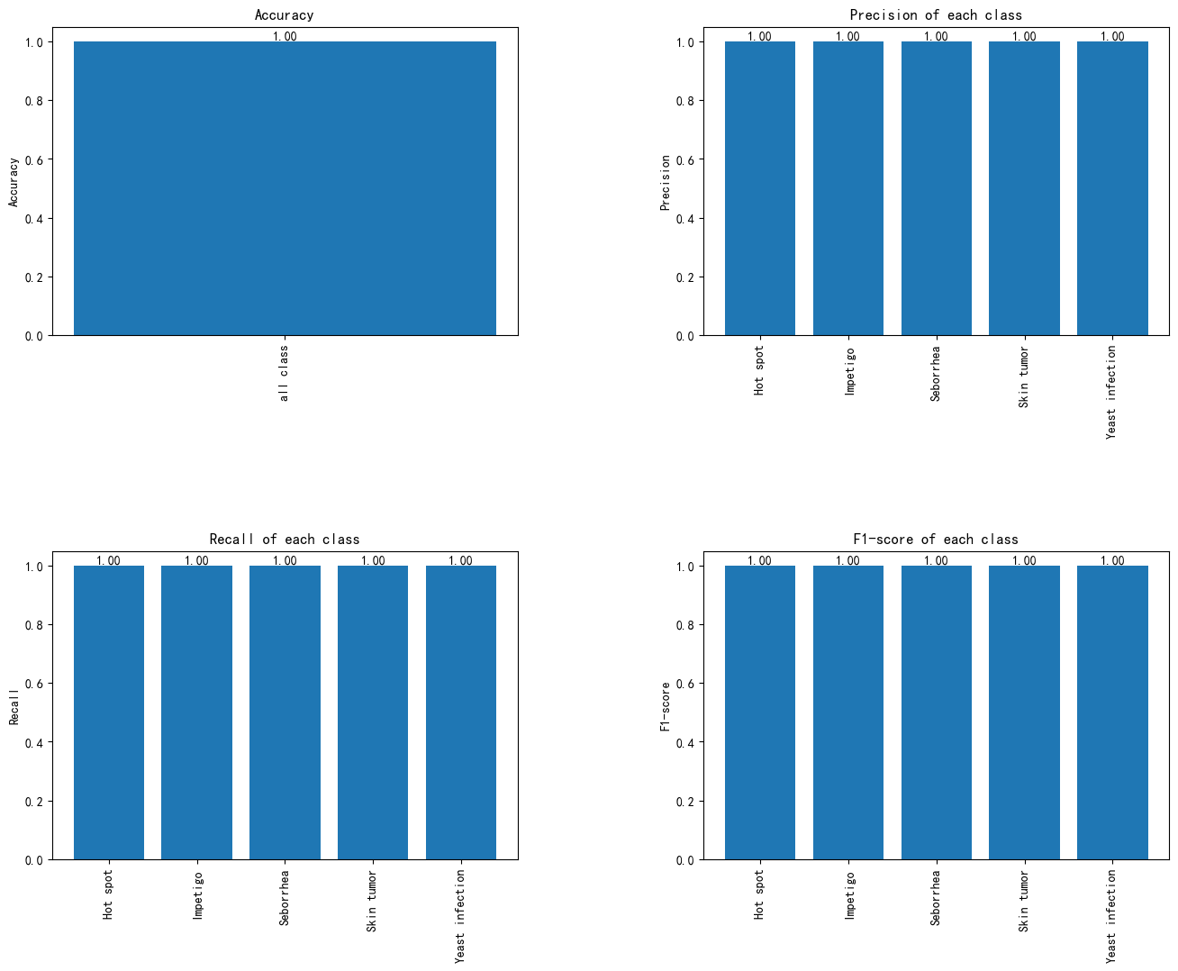 这张图展示了模型在不同评估指标上的表现,包括准确率、精确度、召回率和F1分数。所有指标均为1.00,表明模型在每个类别上的表现均达到了完美水平。准确率为1.00,说明模型在所有类别上的总体分类准确性极高;精确度为1.00,表明预测为某一类别的样本几乎全部正确;召回率同样为1.00,意味着模型没有漏掉任何一个类别的样本;F1分数为1.00,显示了模型在精确度与召回率之间取得了完美的平衡。综上所述,模型在本次任务中的分类性能非常出色,具有极高的准确性和可靠性。