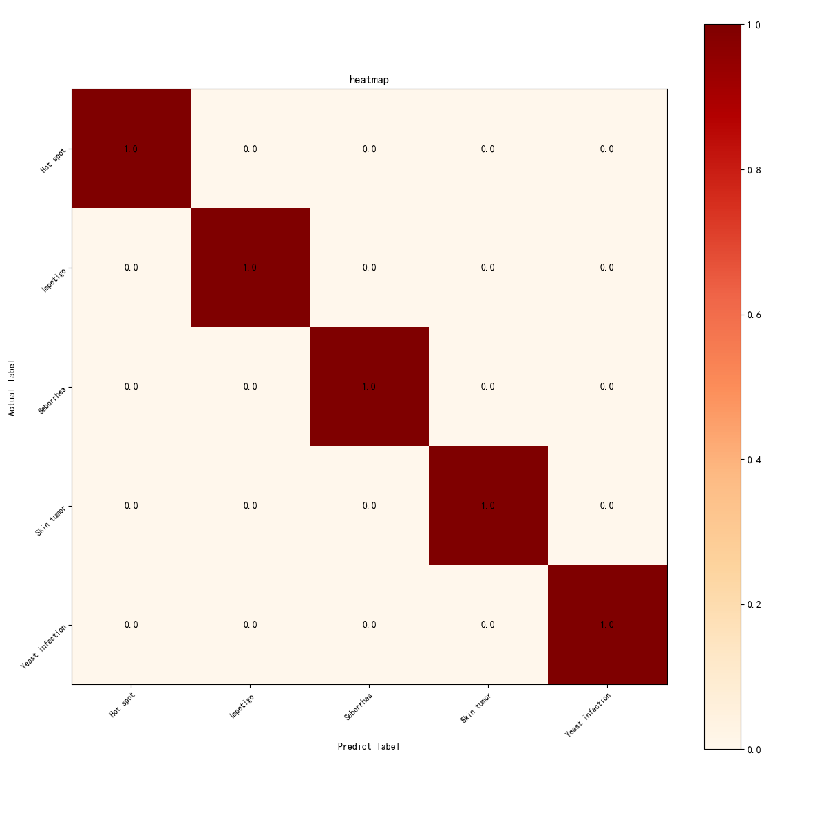该图是一个混淆矩阵的热图,显示了模型在分类任务中的表现。每个单元格表示模型预测标签与实际标签的匹配情况,数字越接近1,说明模型的预测越准确。从图中可以看到,所有类别(如Hot spot、Impetigo、Seborrhea、Skin tumor、Yeast infection)都准确地分类,没有发生任何错误分类。每个类别的对角线上的值为1,表示模型完美地预测了每个类别,验证了模型的高准确率。