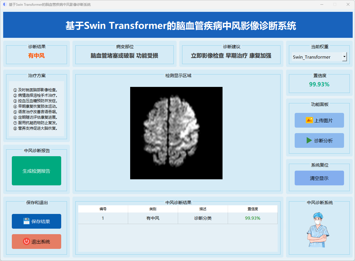 本系统基于Swin Transformer模型,支持对脑血管疾病中风影像进行快速诊断。用户可以上传脑中风影像样本,系统会自动进行分析,识别脑血管健康状态(如健康脑部、脑中风等),并给出诊断结果、分类标签和置信度评分。诊断结果通过清晰的文本和图表直观呈现,帮助医生和科研人员快速评估不同模型(如Swin Transformer)在脑中风分类中的性能表现,从而为进一步的治疗决策提供支持。