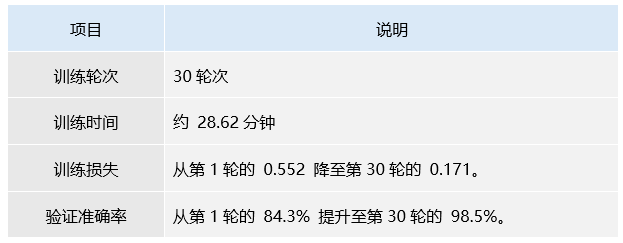 该图展示了训练和验证准确率及交叉熵损失随训练轮次的变化。训练准确率迅速上升并趋于稳定,表明模型在训练数据上学习效果良好;验证准确率逐渐接近训练准确率,显示出较好的泛化能力。训练损失快速下降并保持较低水平,说明误差减少;验证损失虽有波动,但整体下降,可能存在轻微过拟合。总体而言,模型表现出良好的学习与泛化能力。