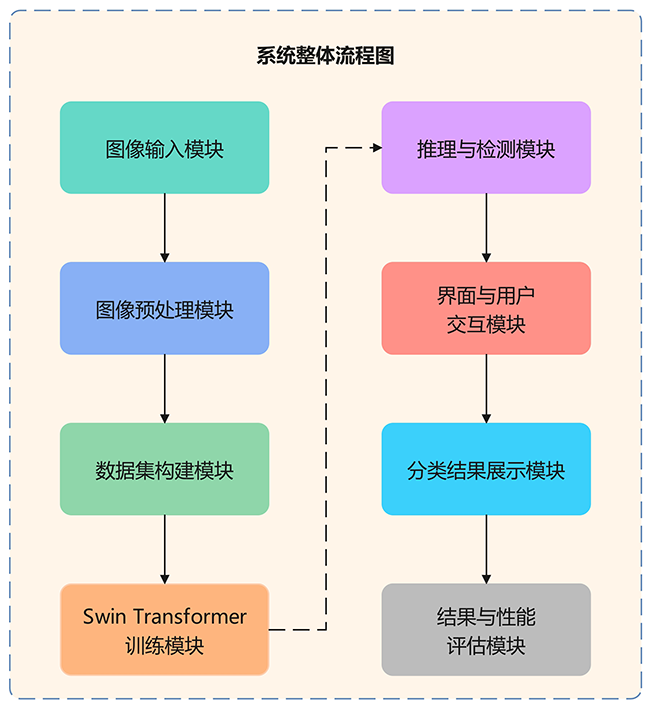 本系统旨在实现脑血管疾病中风的自动化分析与诊断,采用“数据输入 + 模型推理 + 结果展示”的一体化工作流程。系统架构包括图像输入模块、图像预处理模块、数据集准备模块、Swin-Transformer训练模块、推理与检测模块、用户交互界面模块、检测结果展示模块以及实验结果与性能评估模块。通过图形用户界面(GUI),前端界面支持用户便捷地导入脑血管疾病相关影像数据并进行交互操作,而后端则通过Swin-Transformer模型进行实时的脑血管疾病中风影像分析与分类。