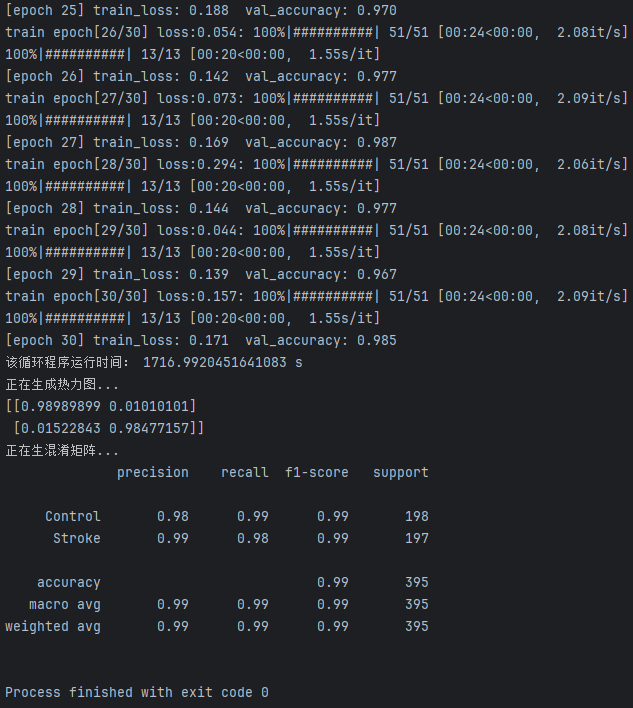 该图展示了模型的评估指标,包括准确率、精确度、召回率和F1分数。整体准确率为0.99,表明模型表现良好。精确度为0.98和0.99,召回率为0.99和0.98,F1分数均为0.99,显示模型在“正常”和“中风”类别上的预测效果均衡,且表现出色。