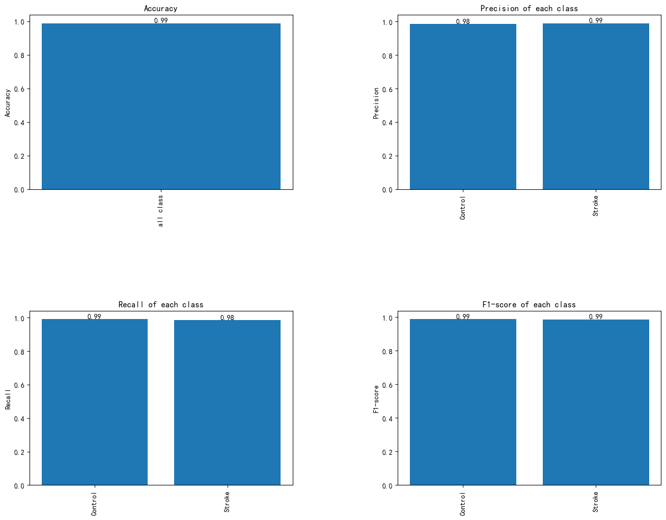 该图展示了模型的评估指标,包括准确率、精确度、召回率和F1分数。整体准确率为0.99,表明模型表现良好。精确度为0.98和0.99,召回率为0.99和0.98,F1分数均为0.99,显示模型在“正常”和“中风”类别上的预测效果均衡,且表现出色。