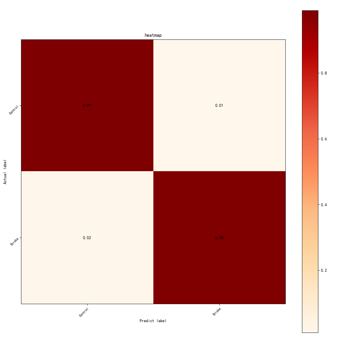该热力图展示了模型的混淆矩阵结果。左上角的0.99表示99%的“正常”样本被正确预测,右上角的0.01表示1%的“正常”样本误预测为“中风”。左下角的0.02表示2%的“中风”样本误预测为“正常”,右下角的0.98表示98%的“中风”样本被正确预测。总体而言,模型表现出色,准确率高。