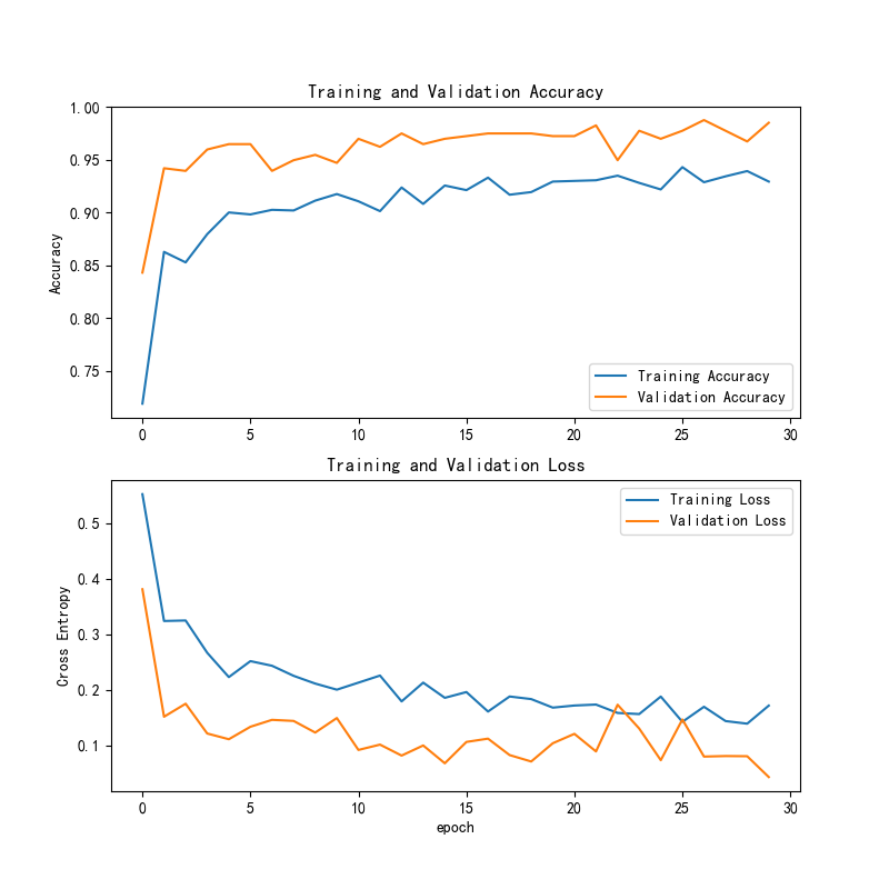 该图展示了训练和验证准确率及交叉熵损失随训练轮次的变化。训练准确率迅速上升并趋于稳定,表明模型在训练数据上学习效果良好;验证准确率逐渐接近训练准确率,显示出较好的泛化能力。训练损失快速下降并保持较低水平,说明误差减少;验证损失虽有波动,但整体下降,可能存在轻微过拟合。总体而言,模型表现出良好的学习与泛化能力。