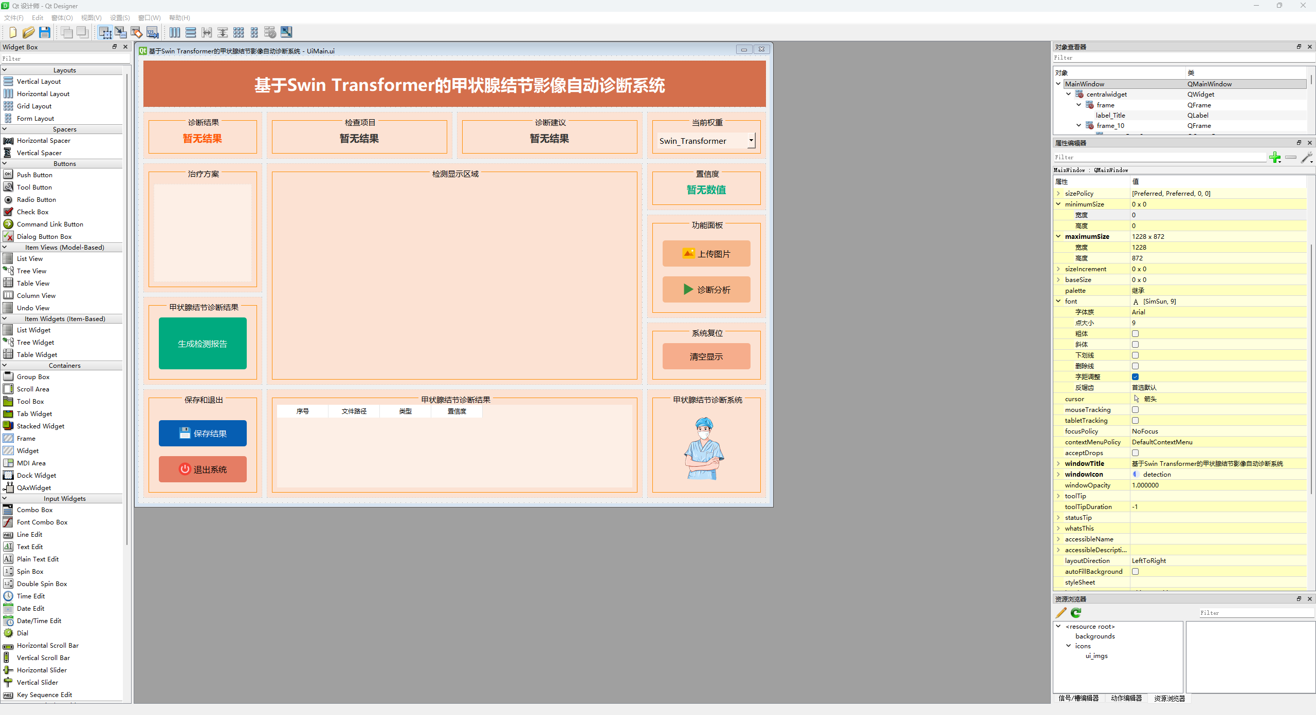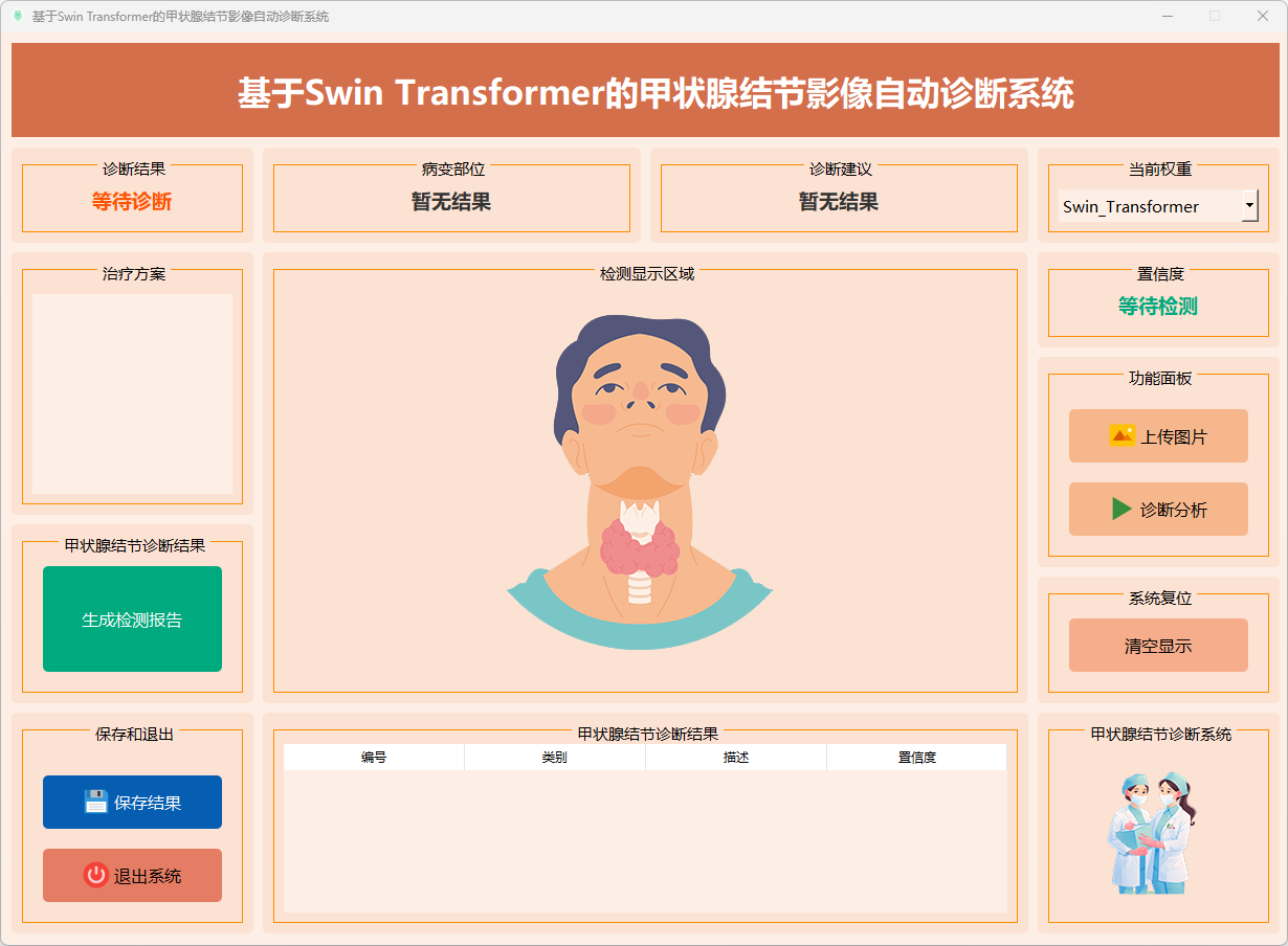 系统主界面集成了甲状腺结节影像上传、模型选择、实时分析及诊断结果展示等功能。用户可在界面中直观选择不同的深度学习模型(如Swin Transformer),上传甲状腺结节影像后,系统将自动进行特征提取与分类分析,并生成对应的诊断结果。界面支持对模型预测结果的可视化展示,方便医生和科研人员对比不同模型在甲状腺结节分类中的性能表现。系统支持诊断良性结节和恶性结节等多种甲状腺疾病。