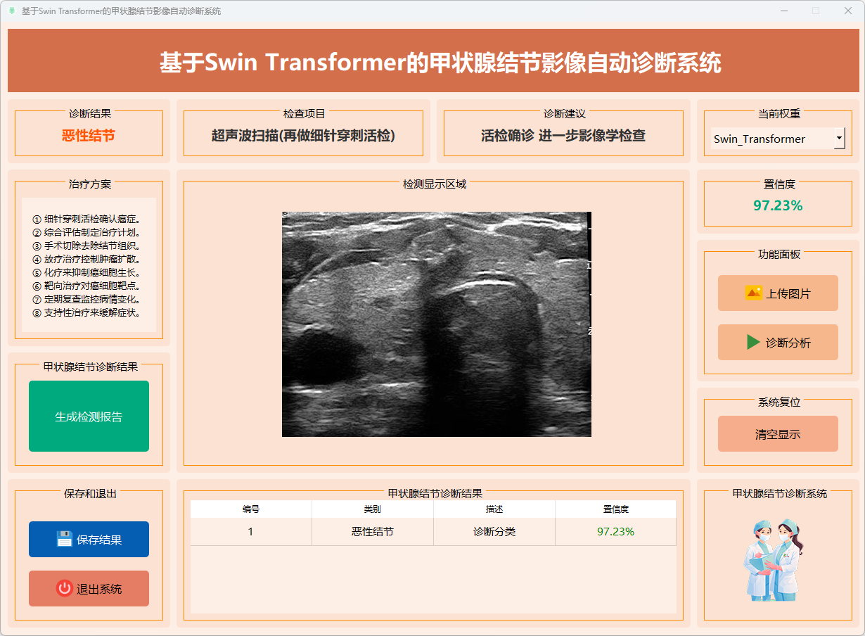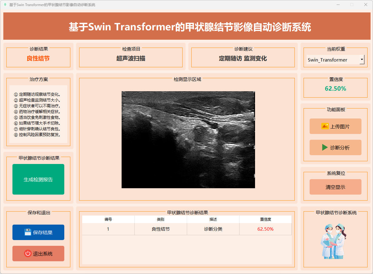 本系统基于Swin Transformer模型,支持对甲状腺结节影像进行快速诊断。用户可以上传甲状腺结节影像样本,系统会自动进行分析,识别甲状腺结节的健康状态(如良性结节、恶性结节等),并给出诊断结果、分类标签和置信度评分。诊断结果通过清晰的文本和图表直观呈现,帮助医生和科研人员快速评估不同模型(如Swin Transformer)在甲状腺结节分类中的性能表现,从而为进一步的治疗决策提供支持。