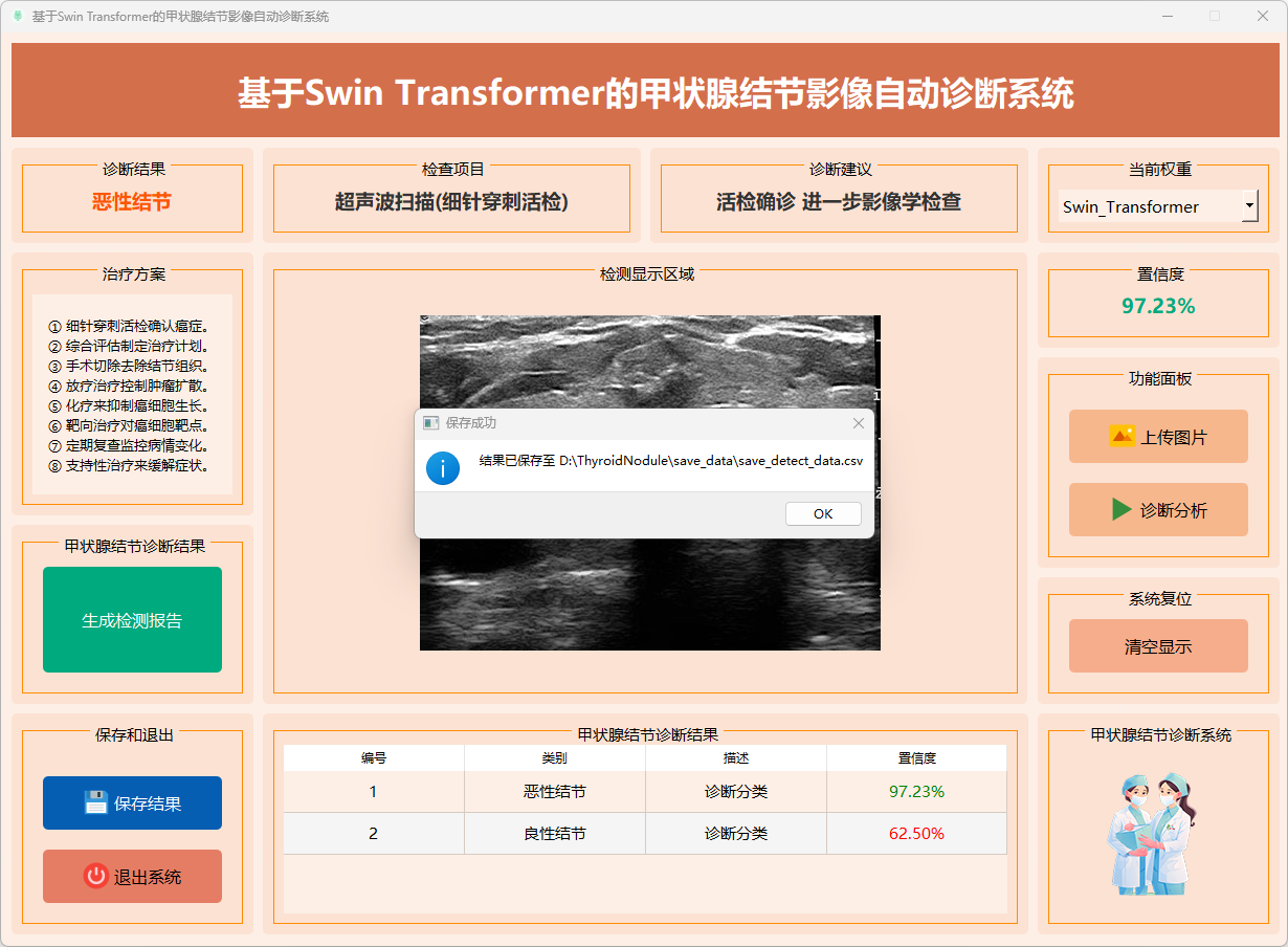 基于Swin Transformer的甲状腺结节影像自动诊断系统研究中,Swin-Transformer模型在甲状腺结节分类任务中表现卓越,具备高准确性和高效率,能够精确区分“良性结节”和“恶性结节”影像等不同病理状态。因此,本系统在甲状腺结节的早期诊断和治疗中展现出巨大的应用潜力,能够为临床医生提供精确的辅助诊断工具,推动甲状腺结节筛查过程的智能化进步。