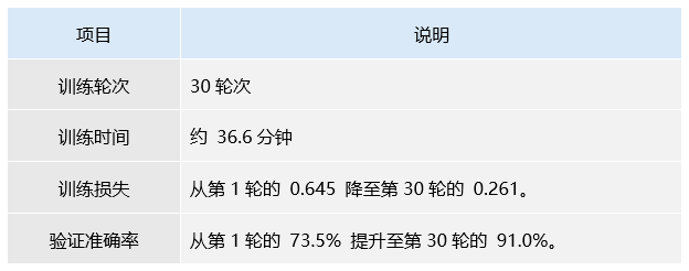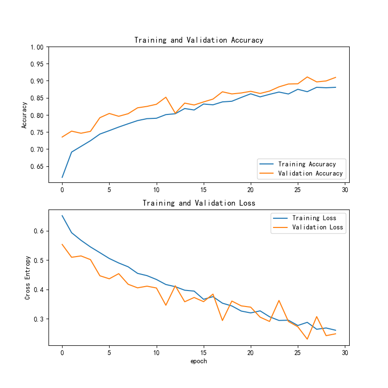 该图展示了训练与验证的准确率和损失变化情况。从第0轮到第30轮,训练准确率逐渐上升,最终接近1.00,验证准确率也呈现稳步增长,最终达到约0.90。训练损失和验证损失则随着训练的进行而逐步下降,验证损失的下降趋势较为平滑,表明模型逐渐收敛且具备较好的泛化能力。这表明模型在训练过程中成功优化,并且在验证数据集上的表现逐渐接近训练数据集,显示出其较强的适应性。