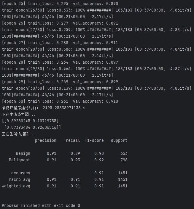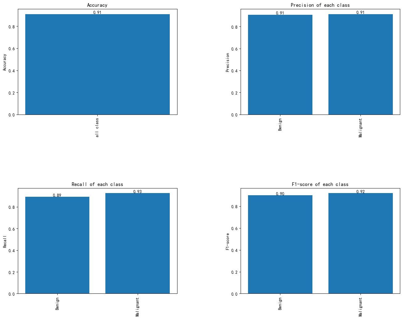 该图展示了模型在各个类别上的性能,包括准确率(Accuracy)、精准率(Precision)、召回率(Recall)和F1-score。模型的准确率为0.91,说明它在整体分类任务中表现优秀。对于每个类别,精准率为0.91,表明模型在每个类别的预测精度较高;召回率对于良性结节为0.89,恶性结节为0.93,表明模型在识别恶性结节时更加敏感;F1-score为0.90(良性结节)和0.92(恶性结节),这表明模型在两个类别的平衡分类性能都表现良好。