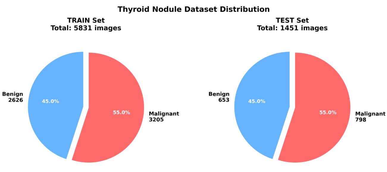 本研究在对原始甲状腺结节影像数据进行清洗与筛选后,构建了一个包含“良性结节”和“恶性结节”两种甲状腺结节状态的影像数据集。该数据集的类别分布均衡,全面涵盖了不同甲状腺结节健康状态,能够真实反映甲状腺结节状态下的影像特征。数据集中每类状态的影像均经过标准化处理与质量控制,确保了样本的代表性与清晰度。该数据集为后续基于深度学习模型进行甲状腺结节健康状态识别与分类提供了坚实的数据支撑,为医学影像分析领域的智能化与自动化研究奠定了基础。