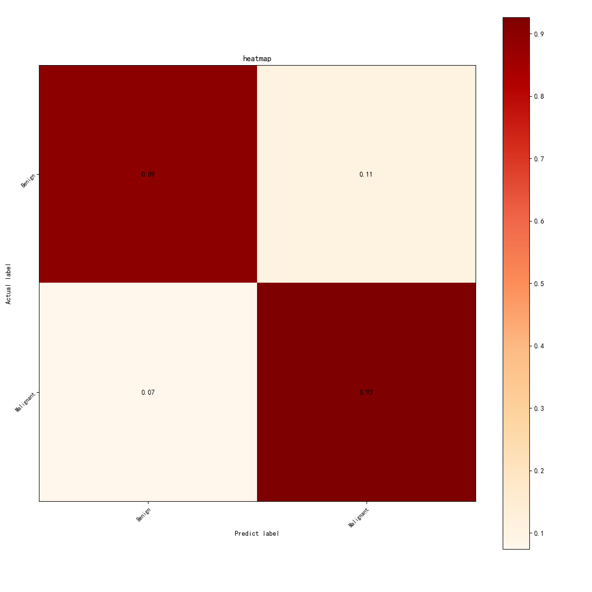 该图展示了模型在甲状腺结节分类任务中的混淆矩阵。对于良性结节,模型将89%的结节正确预测为良性,但有11%误分类为恶性。对于恶性结节,模型正确地预测了93%的恶性结节,误分类的比例较低,仅为7%。该混淆矩阵表明模型在恶性结节的分类上表现较为精准,但仍存在一定的误分类,尤其是将良性结节误判为恶性结节。