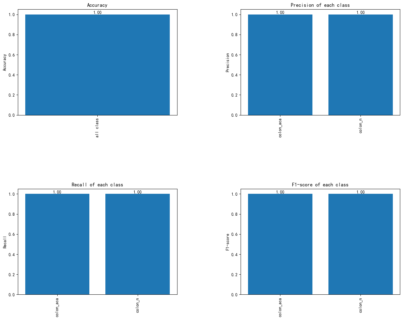 该图显示了模型在训练和测试集上的评估指标,所有指标(准确率、精确度、召回率、F1分数)均为1.0,表明模型在结肠腺癌(colon_aca)和良性结肠组织(colon_n)的分类中表现完美,能够有效区分两类数据。